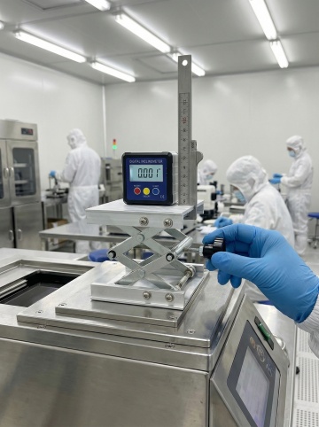 一个干净规整的现代化实验室场景,采用写实风格,以蓝白色调为主,光线明亮柔和,具有清晰的光影层次和细腻的质感表现。画面中可见身着白色防护服的研究人员在先进的白色和蓝色精密仪器设备旁工作,背景是带有规则几何图案的白色墙面。构图采用三分法,空间感强,整体氛围专业、严谨、科技感十足,适合作为背景使用。