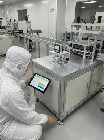 明亮的未来主义风格工厂内部,高科技自动化生产线整齐排列,精密数控机床与机械臂高效运作,身着白色工作服的技术人员在洁净的车间内巡查,柔和的白色与金属银灰色调为主,点缀蓝色科技光效,高天花板上矩阵式LED灯光提供均匀照明,地面光洁如镜反射设备轮廓,整体呈现出高度现代化、秩序井然且充满科技感的先进制造氛围,空间开阔,设备布局科学合理,传达出高效、精准、创新的工业美学。