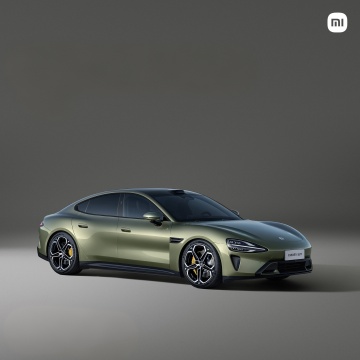 写实摄影风格,一辆白色的流线型电动轿车停在开阔的公路上,车身光洁呈现出细腻的金属质感,前脸设计简洁,车灯锐利有神,大尺寸合金轮毂,车窗玻璃透明。背景是壮丽的雪山山脉,山顶覆盖着皑皑白雪,山腰处有茂密的绿色松树,天空湛蓝,飘着几朵洁白的云彩,阳光明媚,光线充足,照亮了整个场景,营造出一种宁静、开阔、现代且富有科技感的氛围,色彩鲜明和谐,构图采用三分法,汽车位于画面中下方,占据主要视觉位置,背景的山脉和天空形成层次感,整体画面清晰锐利,细节丰富,具有高品质的商业摄影质感。