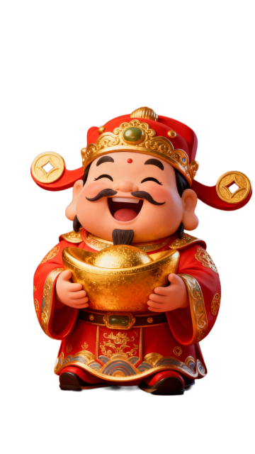 软3D风卡通财神,喜庆红金配色,鎏金元宝与铜钱环绕,重拟物质感,节日氛围浓厚。