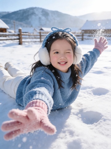 春烟袅袅的村庄,地面覆盖厚厚的积雪,中间湖冰面上有几个小小的孩子在玩耍,冰蓝色调为主,清新自然,高清细节,所有元素均为毛茸茸的绒毛材质