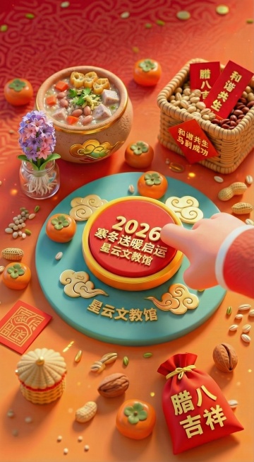 国潮风融合重拟物与鎏金元素,剪纸风格梅花枝点缀,中式古典氛围浓厚,喜庆红金配色烘托腊八节温馨年味。