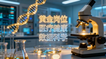超写实风格医疗背景,主色调为科技蓝与深蓝渐变,柔和的侧顶光源营造出明亮通透的氛围,光线在玻璃器皿上形成清晰的高光与细腻阴影。前景中,戴着白色无菌手套的手正小心翼翼地握着一支装有透明液体的玻璃试管,手指关节自然弯曲,手套纹理清晰可见。背景中虚化的实验室环境里,多个不同形状的玻璃烧杯与试管整齐排列,后方叠加着动态的蓝色医疗数据波形图、DNA双螺旋结构和医疗图表的半透明全息投影效果,整体呈现出科技感与专业性并存的氛围。画面构图采用三分法,手部与试管位于视觉中心偏右位置,背景元素有序分布,形成层次感强的视觉引导。