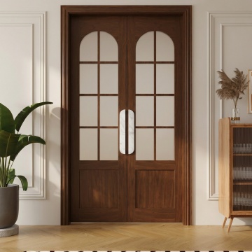 北欧风格室内场景,中央是一扇浅木色的简约实木门,门把为黑色金属材质,门框线条简洁,光线从右侧柔和洒入,在门上形成自然的光影渐变,地面为浅色木质地板,纹理清晰,左侧摆放一个原木色矮柜,柜上有两个白色陶瓷花瓶和一个金属摆件,墙上挂着两幅线条简约的黑白装饰画,右侧是一个同色系的木质储物柜,柜上摆放着插有干花的透明花瓶,整体色调以原木色和白色为主,营造出宁静、自然、温馨的居家氛围,空间布局对称且通透,细节处展现出简约而不失质感的设计美学。