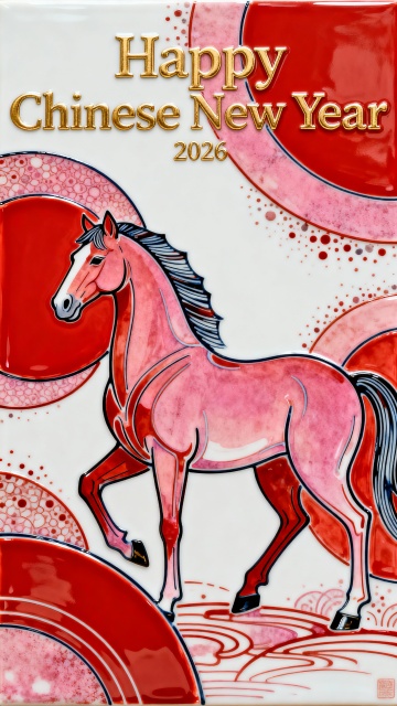 中式工笔浮雕风,鎏金描边勾勒白马祥瑞,粉金配色尽显奢华喜庆,松树流水点缀,寓意吉祥如意,春节氛围唯美优雅。