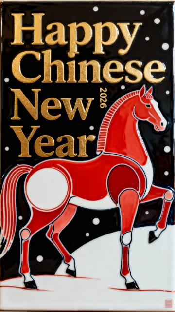 一匹黑色奔跑中的马,暗绿色的手写字体大大写着“2026”铺满背景,胭脂红背景
