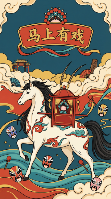国潮插画风,融合皮影与剪纸元素,拟人化马车承载戏曲角色,喜庆祥云环绕,展现中式古典与民族韵味,节日氛围浓厚。