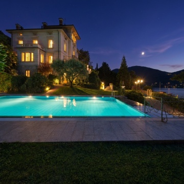 现代简约风格别墅外观,黄昏时分,深蓝色渐变天空,建筑采用水平线条设计,大面积落地玻璃窗透出温暖室内灯光,二层悬挑阳台带玻璃护栏,外墙结合浅色石材与平滑涂料,底部石材墙面纹理清晰,周围环绕修剪整齐的绿色草坪、低矮灌木和高大树木,地面铺设灰色石板台阶,建筑轮廓有嵌入式暖黄色LED灯带照明,光影对比柔和,整体呈现宁静高端的居住氛围,不同样式的现代别墅设计,注重几何感与自然环境的融合。