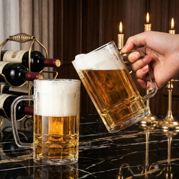 超写实摄影风格,一杯装满深琥珀色啤酒的高脚玻璃杯,顶部覆盖着厚实细腻的白色泡沫,啤酒从杯中剧烈飞溅而出,形成动感十足的金色水花和无数细小的酒滴,背景为深邃的黑色,点缀着散景光斑营造出梦幻氛围,整体光影对比强烈,强调液体的透明质感与泡沫的绵密肌理,水花四溅的动态瞬间被清晰捕捉,充满活力与清凉感。