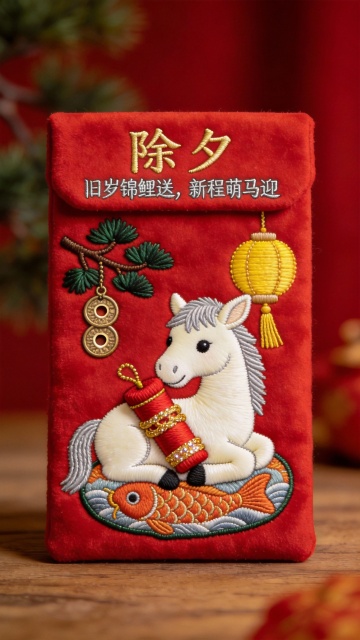 刺绣风红袋,工笔拟人萌马衔鞭,鱼跃金鳞,灯笼松枝点缀,国潮喜庆迎除夕。
