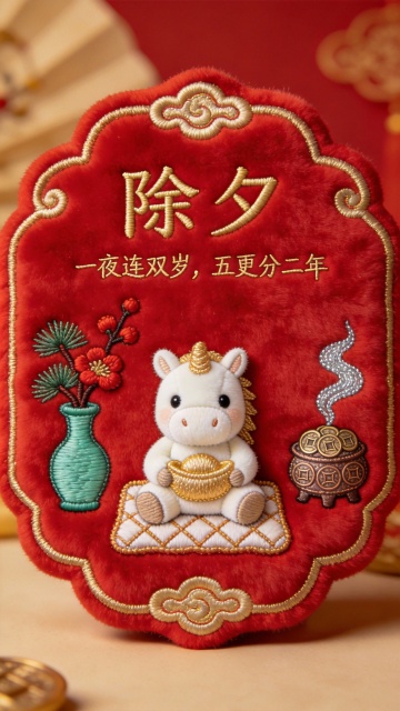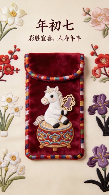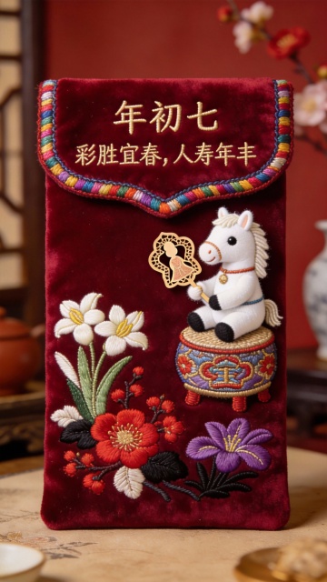 中式刺绣风红包,融合工笔花鸟与拟人马儿,浮雕质感十足,喜庆复古,寓意年初七人寿年丰,尽显传统节日之美。