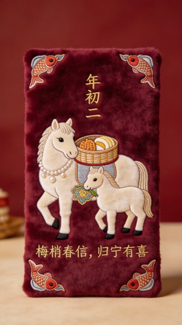 刺绣风国潮设计,拟人化马儿驮篮送春,融合中式喜庆与卡通萌感,四角锦鲤环绕,传递年初二归宁有喜的节日祝福。
