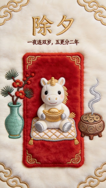 刺绣风与软3D结合,萌趣小马捧金元宝,国潮元素点缀,喜庆温馨迎除夕。