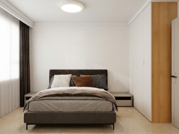 全景视角,高清画质,3:4比例。一间现代简约风格的豪华酒店卧室,视角正对床头与背景墙。环境光线极暗,仅由暖黄偏红光(色温1250K,照度低于10lux)勾勒轮廓。光线主要来自:1. 床头背景板上方一条细长的间接洗墙灯带,发出柔和均匀的漫射光;2. 天花板凹槽内隐藏的灯带提供基础环境照明。床头柜上放置着一台设计精致的迷你香薰机(类似无印良品风格)和一个有质感的织物面小型音响。床头柜表面集成了一块极简