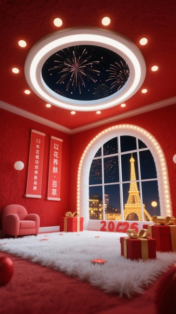 梦幻雪境,3D轻拟物风,鎏金灯笼点缀虚拟自然,粒子飘雪营造唯美感与温馨氛围,节日气息盎然。