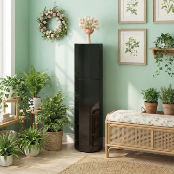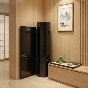 一张空调产品的商业摄影图片,展示一台立式圆柱形空调,纯白色机身,正面有黑色竖条形出风口,顶部和底部有银色金属装饰圈,机身顶部有品牌标志区域,整体采用简约现代的设计风格,高清晰度,光滑的塑料和金属质感,正面视角,居中构图,纯白色背景,柔和均匀的无影光源,突出产品的线条感和材质细节,专业的产品展示效果。