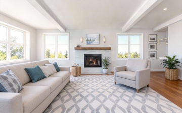 极简主义风格客厅3D渲染,浅灰色布艺沙发搭配米色靠垫,沙发前铺设浅灰色条纹地毯,旁边放置金属框架圆形小茶几,浅灰色墙面挂有简约装饰画,大面积落地窗配以白色半透明纱帘,窗外变换为自然绿植景观,整体色调以灰白为主,柔和自然光从窗户洒入,形成清晰的光影层次,地面为大块浅灰色瓷砖,空间干净通透,线条简洁流畅,营造宁静舒适的氛围。