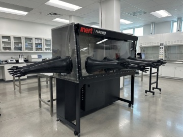 现代化高科技实验室场景,画面干净规整,适合作为背景。明亮的白色与蓝色调为主,洁净的白色墙面镶嵌着深蓝色方块瓷砖,地面为光滑的浅灰色。前景有两位身着全套白色防护服、佩戴护目镜和口罩的科研人员,一位正坐在操作台边专注查看电脑屏幕,另一位站立于大型精密仪器前操作控制面板。实验室中央和后方分布着多台先进的白色与银色相间的分析仪器、设备,带有蓝色显示屏和控制面板,仪器间有金属管道和电缆有序连接。右侧有机械臂装置,左侧前景有透明玻璃容器和绿色植物点缀。整体光线均匀柔和,以冷色调为主,营造出专业、严谨、先进且一尘不染的科研氛围,构图平衡,空间感强,视觉层次分明,信息传达清晰,符合高科技科研环境的审美与功能需求。