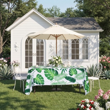 阳光明媚的花园露台餐厅,原木色方形餐桌搭配藤编靠背餐椅,桌面上摆放着白色陶瓷餐具和插满粉色玫瑰的玻璃花瓶,四周被茂密的绿植和盛开的花卉环绕,顶部悬挂着造型简约的白色布艺吊灯,地面铺设浅色防滑地砖,远处可见木质围栏和蓝天白云,整体呈现出清新自然、温馨舒适的田园风格,光线明亮柔和,营造出轻松愉悦的用餐氛围。