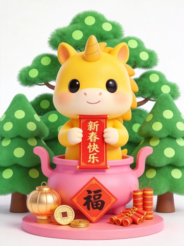 软3D风可爱独角兽手持鎏金元宝,毛发生长质感细腻,梦幻粉红背景点缀金币与福袋,喜庆新春氛围浓厚。