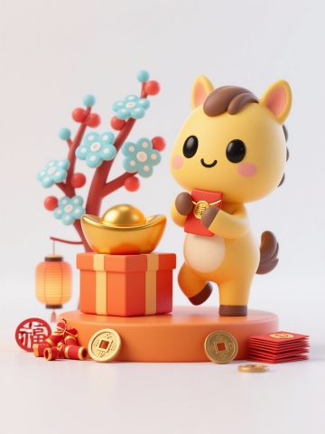 软3D粘土风卡通马,手持金元宝与福袋,搭配红灯笼,喜庆可爱,充满春节氛围。