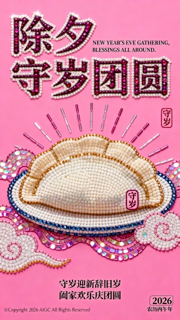 画面顶部巨大的复古楷书中文标题 “初五 破五迎财”,初五旁穿插微小的无衬线英文说明文字:“BREAKING FIVE, DRIVING AWAY MISFORTUNE.”。画面的中心是主体元宝(旁边印有印章 “破五”,周围祥云环绕,加背景同色放射线)。元宝下方的中央书写两行横排的细小的非衬线体中文:“破五驱邪迎富贵 开门纳吉接财神”。画面右下角放日期标签 “2026 农历丙午年”,左下角放小号版权文案 “Copyright 2026 AIGC All Rights Reserved”。正红色背景。
