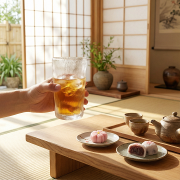 清新自然的森林场景,柔和光影中一瓶茶饮静置于野花丛间,融合东亚风与轻拟物设计,水彩质感与胶片色调营造静谧文艺氛围。