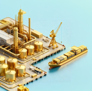 一艘大型集装箱货轮的平面矢量图标,船体和集装箱呈现出从深绿色到浅绿色的渐变效果,船头下方有波浪线条装饰,整体设计简洁现代,轮廓清晰,白色背景,风格为简约的商业标识设计。