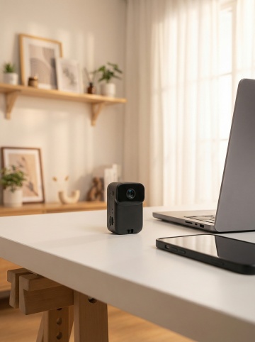 北欧简约写实风设计,白色蓝牙音箱与原木茶几、暖调居家环境结合,营造治愈松弛的居家氛围