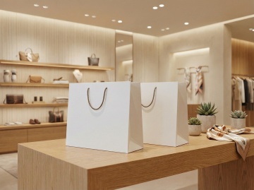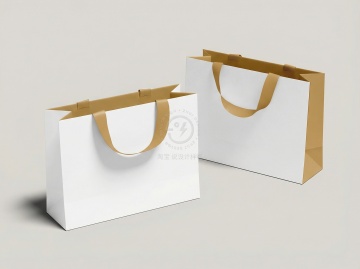 极简主义风格白色手提袋,袋身采用厚实挺括的哑光白色卡纸材质,表面光滑无纹理,搭配灰绿色宽扁状皮质手提带,手提带与袋身连接处有精致的缝线细节,袋子放置于浅灰色光滑水泥台面上,整体呈现出柔和的侧上方自然光照射效果,光线在袋身侧面形成自然的明暗过渡阴影,水泥台面反射出微弱的光泽,背景更换为简约的米白色渐变磨砂质感墙面,手提袋样式调整为底部带有细微内收弧度的梯形轮廓设计,整体画面保持干净、高级、简约的静物摄影氛围,色彩统一在低饱和度的灰白绿配色体系中,突出材质的细腻质感和光影的微妙变化。