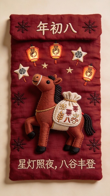 刺绣风工笔质感,重拟物浮雕工艺,中式喜庆元素融合民族纹样,星灯与马匹象征年初八祈福丰登,传递传统节日祝福。