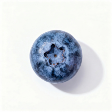 三颗饱满圆润的新鲜蓝莓,呈现深邃的靛蓝色至紫黑色渐变,表面覆盖着自然的白色果霜,水珠晶莹剔透地附着在果皮上,折射出光泽。蓝莓顶部带有深褐色的星形果蒂,部分微微开裂。蓝莓下方点缀着几片翠绿的椭圆形叶子,叶脉清晰可见,叶尖略尖,叶片边缘光滑,整体构图简洁聚焦,以纯白色为背景,突出蓝莓的新鲜质感和诱人光泽,营造出清新、健康、水润的视觉效果。