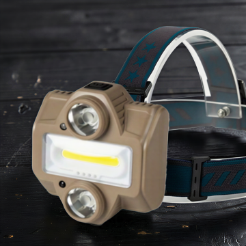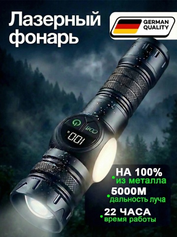 背景是夜晚森林中的地上,一支黑色战术手电筒的特写,一半的体积被雨水浸泡在水中(从地面泼溅而起,激起水花,水花晶莹剔透,折射着光线),背景是森林。