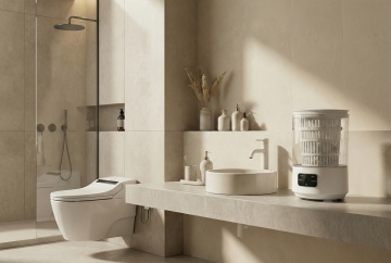一张高质量写实风格的水龙头特写摄影,主体为亮银色镀铬双把手水龙头,水流从弯曲的出水口优雅地呈细长弧线注入下方光洁的白色陶瓷水槽,水花在盆底溅起细小涟漪并形成水膜反光。背景采用柔和的浅景深处理,左侧可见木质窗框边缘透入的温暖自然光,右侧模糊的绿色植物盆栽增添生机,整体色调以银白、浅木色、淡绿为主,营造出温馨、洁净、自然的卫浴或厨房氛围,光影过渡细腻,金属表面有清晰的高光和轻微阴影,突出水龙头的精致质感与水流的动态美感。