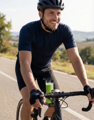 一位戴着头盔、背着双肩包的山地自行车手,正站在山地自行车旁,一手扶着车把,另一手抬起指向远方的天空,夕阳的光芒从他身后照射过来,形成鲜明的剪影效果,他穿着长袖骑行服和短裤,站在长满草的山顶上,背景是壮丽的日落天空,天空中布满了蓝色和橙色渐变的云彩,远处的山峦在霞光中若隐若现,整个画面充满了探险和自由的氛围,具有强烈的视觉冲击力和艺术感。