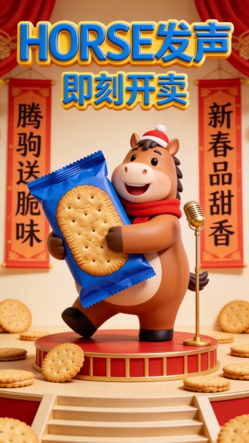 软3D风格拟人马形象,国潮风新春场景,喜庆红金配色,卡通趣味十足,手持饼干袋立于舞台,传递节日欢愉与产品卖点。