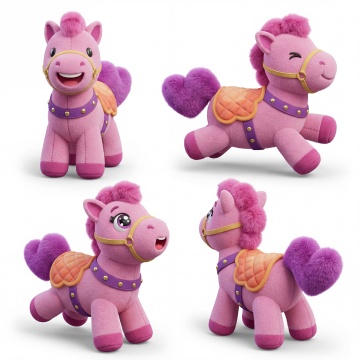 软3D粘土风格的可爱独角兽摇马,粉色鬃毛与甜美元素交织,充满童趣与梦幻感,适合儿童节主题设计。
