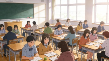 动漫风教室,水彩质感光影洒落,夕阳透过窗棂,书本静置桌头,温馨静谧,柔光弥漫,仿佛时光停驻。