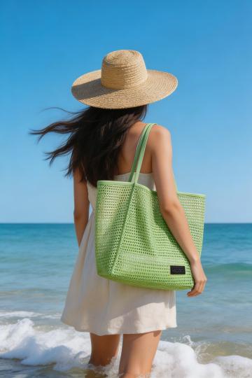 清新自然的海边场景,搭配浅色连衣裙与草帽,绿色编织托特包增添时尚感与轻拟物风,整体呈现夏日浪漫与舒适质感。