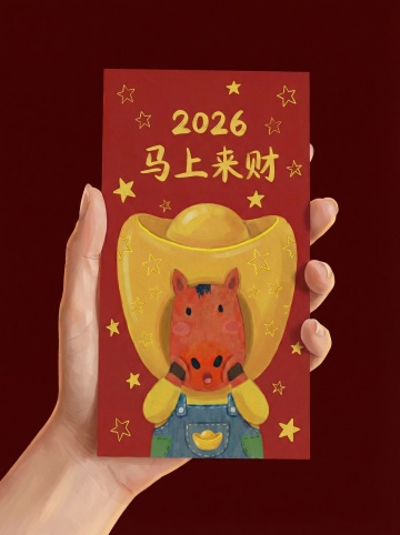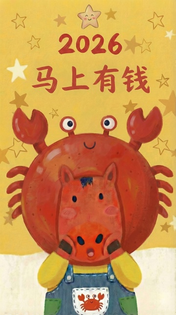 喜庆红底搭配卡通拟人小马,扁平插画风融合国潮元素,金币元宝点缀,传递新春吉祥寓意。