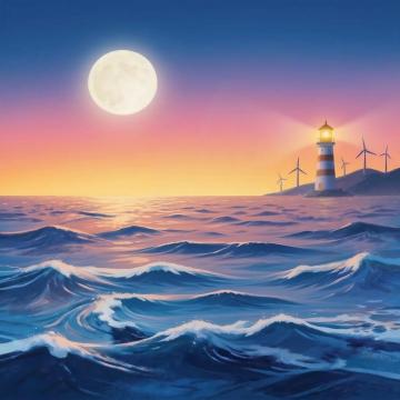 印象派风格海上日落,巨大的橙黄色太阳低垂在地平线上,天空被温暖的橘红、粉紫和淡蓝渐变色渲染,云层呈现柔和的笔触和朦胧的边缘,波光粼粼的海面反射着太阳的金色光芒,水面波纹以短促而活泼的笔触描绘,整体画面充满光影变幻和色彩的微妙交融,营造出宁静而温暖的黄昏氛围,具有浓厚的艺术感和浪漫情调。