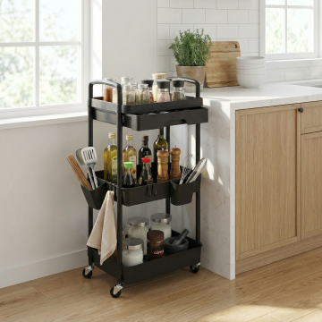 俯视角构图,现代极简主义厨房中央的中岛台特写,台面上铺着浅灰色大理石纹石英石,右侧并排放置着三个哑光黑陶瓷碗,碗中分别盛有:碾碎的藏红花丝、深棕色肉桂棒和浅金色燕麦片。中岛台左侧立着一个透明玻璃水壶,壶中漂浮着几片青柠,旁边斜靠着一本翻开的硬壳食谱,书页边缘露出手绘的香料插图。台面下方悬挂着三个几何形黄铜吊灯,灯光在台面上形成三个重叠的暖黄色光斑。背景中,白色哑光橱柜与原木色开放格交错排列,开放格里整齐码放着带标签的玻璃储物罐,最上层角落摆着一盆垂吊的绿萝,藤蔓自然垂落在白色瓷砖墙面上。阳光从右侧的百叶窗斜射进来,在地面投射出规则的条形光影,整体色调以灰白为底,点缀原木色的温暖和黄铜的轻奢质感,构图采用对角线平衡,视觉焦点集中在中岛台的香料碗与光影交错处。