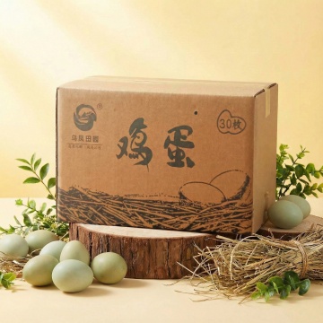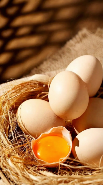一堆新鲜的土鸡蛋,部分鸡蛋散落在竹编托盘里,一个鸡蛋被轻轻敲开,金黄的蛋黄和透明的蛋清缓缓流出,旁边放着一些干枯的玉米棒和饱满的大豆,背景是质朴的木质桌面,整体色调温暖自然,光线柔和,营造出一种原生态的农家氛围,食物质感细腻真实,细节清晰可见。