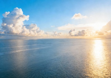 极简主义风格海滩风景,明亮的阳光从左上角照射,海面呈现出深邃的靛蓝色与清澈的天蓝色渐变,浪花为白色并带有细腻的泡沫,沙滩是温暖的米黄色,天空中有少量蓬松的白云,整体画面干净整洁,线条流畅,色彩饱和度高,具有现代设计感,营造出宁静、开阔、清爽的氛围。