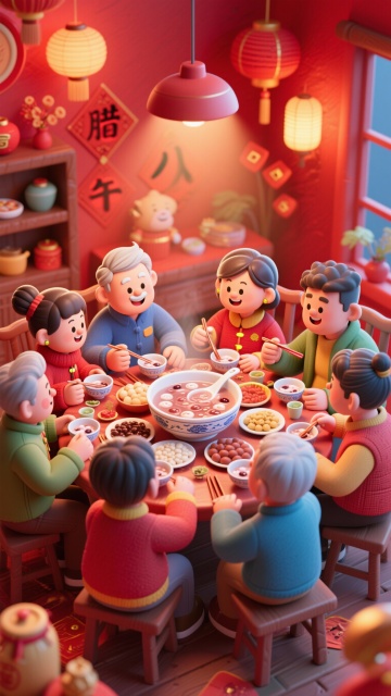 软3D风插画,毛发生长质感营造温馨喜庆氛围,卡通家庭围坐赏雪景,红灯笼与烟花点缀元旦夜,充满节日温暖与童趣。