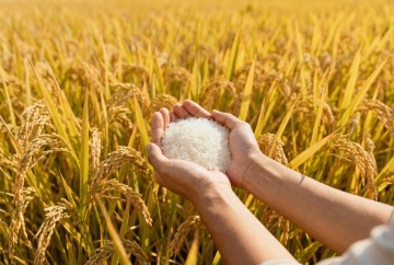 高清写实风格的大米摄影,画面中散落着晶莹饱满的白色米粒,两个浅棕色木质方形米盒内装满圆润洁白的大米,盒边装饰着数支金黄成熟的稻穗,背景是编织纹理的深绿色布艺,整体色调以米白、浅棕、金黄和墨绿为主,光线柔和从斜上方洒落,米粒表面泛着细腻光泽,稻穗呈现自然弯曲形态,木质米盒有精致的拼接纹路,营造出质朴、纯净、原生态的温馨氛围,突出大米的天然质感与丰收的喜悦。