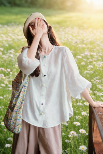 清新森林背景,女孩手捧雏菊,卡通动漫风设计,营造梦幻夏日氛围。