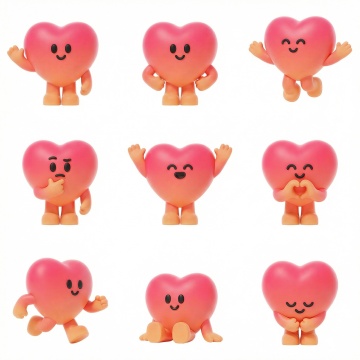 白色背景上,六个造型完全不同但元素内容相同的3D卡通表情系列素材集合规整排布,每个表情都是圆形黄色脸蛋,带有黑色“<”和“>”形状的眯眼,微笑的黑色弯嘴,以及周围分布的粉色爱心元素,保持圆润光滑的3D质感,统一的卡通风格,光影柔和,每个表情通过爱心数量、位置、大小或表情细节(如嘴型弧度微调)形成完全不同的造型,整体色彩变换多样,系列感强,设计感十足。