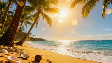 广角低角度视角,盛夏正午的热带海湾,天空被渲染成渐变的天蓝色,点缀着被阳光穿透的棉花糖般的积云,海面在强光下闪烁着千万颗碎钻般的光芒,呈现从透明浅蓝到靛蓝的层次感,金色沙滩上散落着粉白相间的贝壳和一个半埋在沙中的彩虹色充气游泳圈,五棵高大的棕榈树倾斜着向海面伸展,枝叶间悬挂着几个熟透的棕色椰子,三个彩色冲浪板斜靠在树干上,远处海面上有两个小小的冲浪者剪影,几只海鸥在热气流中盘旋,空气中漂浮着细微的金色尘埃,整体色调是明亮的绿松石蓝与阳光黄的交响,洋溢着海洋的咸湿气息与无尽的夏日自由。