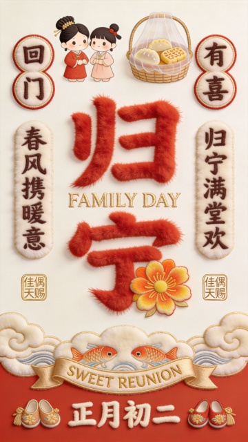 国潮风刺绣质感,毛发生长字体呈现“归宁”,融合卡通人物与传统元素,喜庆中式氛围浓厚,正月初二团圆主题鲜明。